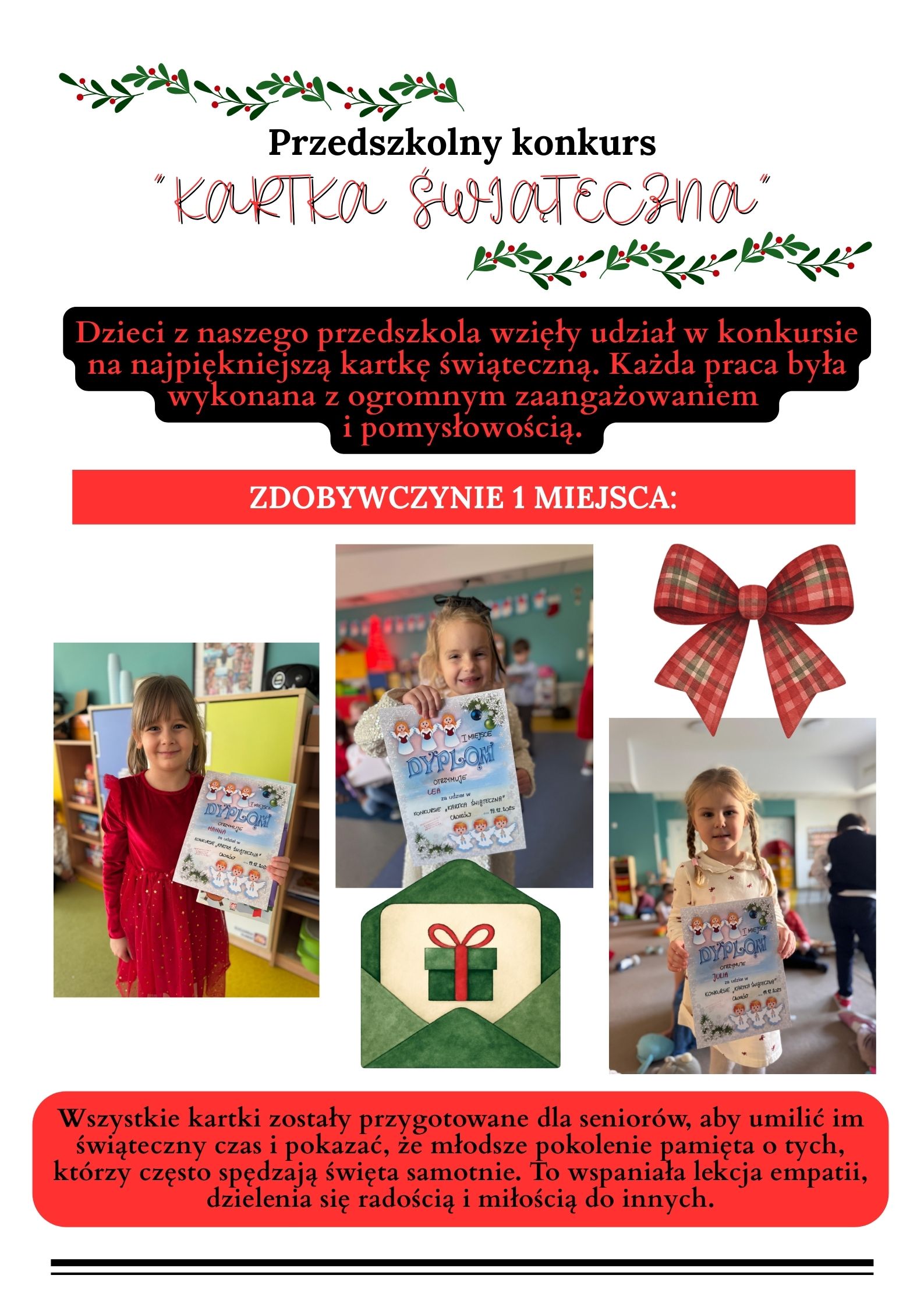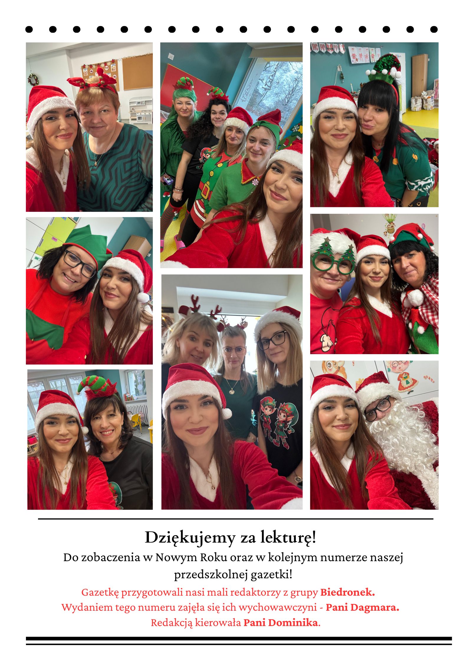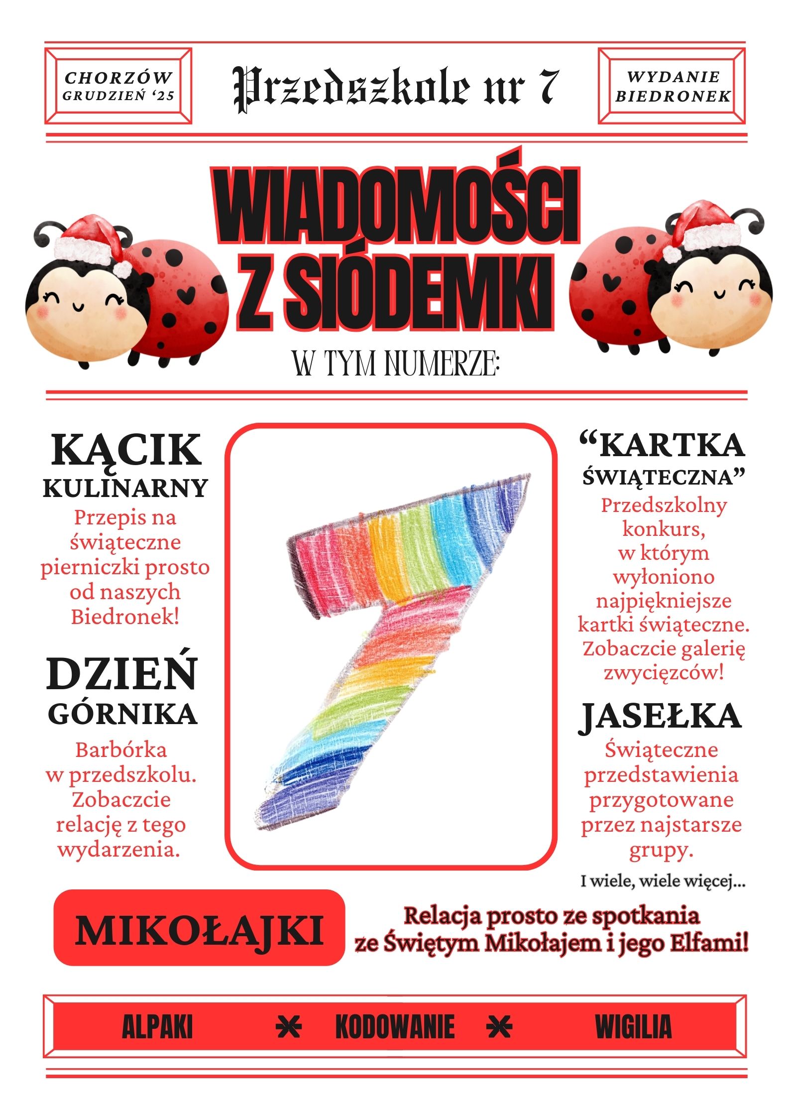 Grudniowy numer naszej gazetki jest już gotowy! Tym razem stworzyła go grupa Biedronek razem ze swoją wychowawczynią, Panią Dagmarą. Mamy nadzieję, że lektura sprawi Państwu wiele radości. Całej społeczności naszego przedszkola życzymy ciepłych, rodzinnych Świąt Bożego Narodzenia i Szczęśliwego Nowego Roku. Do zobaczenia w 2026!